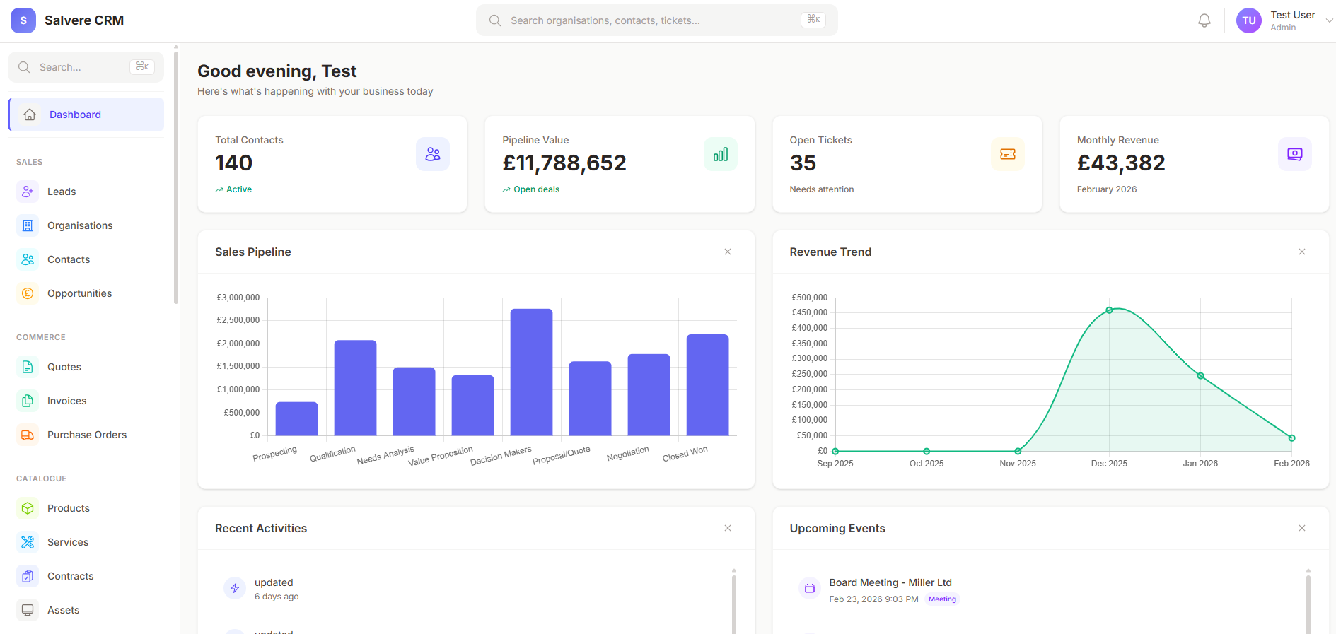 The contact and organisation management system supports the relationship structures that vTiger forced into generic containers. Hierarchical relationships between organisations, role-based contact linking, and a complete activity timeline per record replace vTiger’s flat contact-account model.