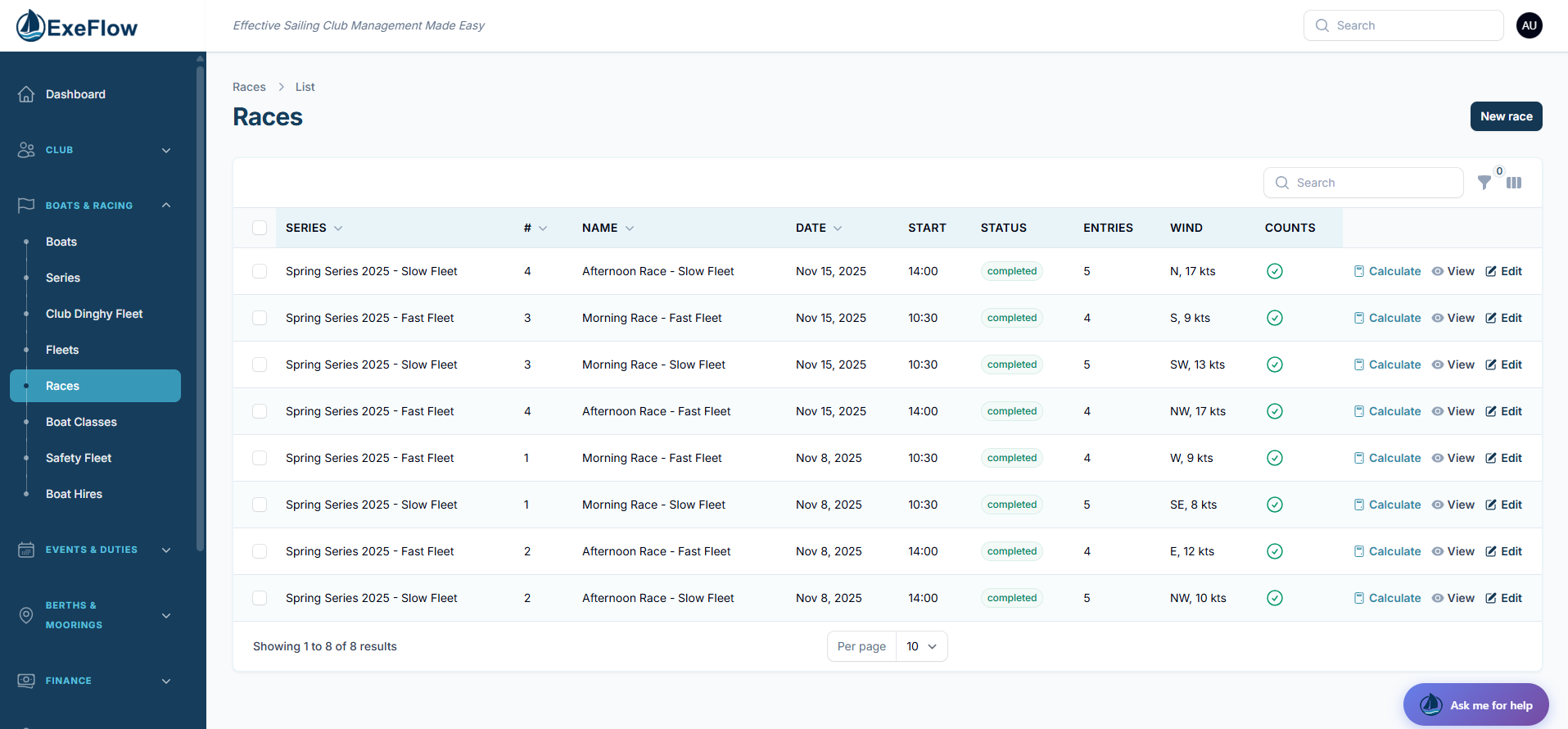 Race management was the most domain-specific module. It supports multiple handicap scoring systems, series management with configurable discard rules, automated result calculation, and crew tracking. Race officers enter finishing times and the system handles handicap correction, series standings, and trophy tracking automatically.