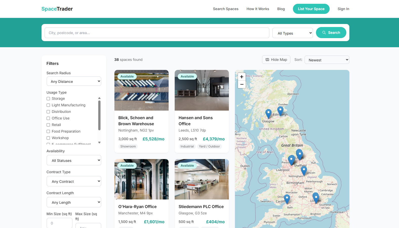 Space Trader launched with an initial inventory of listed spaces and has grown through both direct seller acquisition and organic inbound listings. The search analytics provide ongoing insight into market demand, informing the platform operator’s commercial strategy for which geographic areas and space types to prioritise for supply growth.